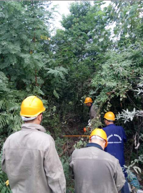 加壓站負(fù)責(zé)維護(hù)供電線路總長為16公里,且大多穿越山林,夏季樹木長勢(shì)格外迅猛,掃林任務(wù)顯得更加繁重。在密閉的樹林里異常悶熱,到處都是蚊蟲樹刺,巡線人員早上7點(diǎn)之前就早早出發(fā),戴著安全帽穿著厚厚的工作服,,頂著火辣辣的太陽,流血流汗,消滅影響供電安全的每一處樹障。(圖為工作人員正在砍伐樹障)