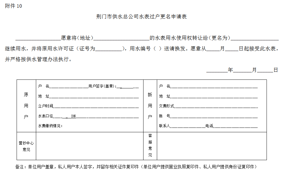 10.《荊門(mén)市供水總公司水表過(guò)戶(hù)更名申請(qǐng)表》