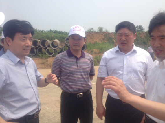 總經(jīng)理陳衛(wèi)國(中)和屈家?guī)X管理區(qū)工委書記湯旺林(右二)、工委主任鄭斌(左一)、市水務(wù)局局長曾云(右一)商談施工事宜。