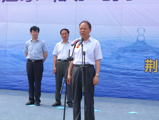 總經(jīng)理陳衛(wèi)國(guó)(中)和屈家?guī)X管理區(qū)工委書記湯旺林(右二)、工委主任鄭斌(左一)、市水務(wù)局局長(zhǎng)曾云(右一)商談施工事宜。 ![]() 市委書記萬勇宣布工程開工