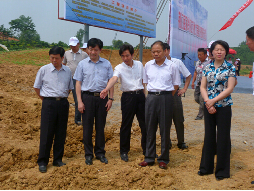 ![]() 市委書記萬勇(右二)、市長(zhǎng)肖菊華(右一)、副市長(zhǎng)鄭中華(左一)等領(lǐng)導(dǎo)觀摩施工現(xiàn)場(chǎng)