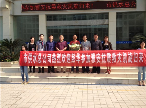 5月12日上午,市住建委領(lǐng)導(dǎo)以及供水總公司干部職工在供水大樓前熱烈歡迎供水職工彭華從四川雅安救災(zāi)一線平安勝利歸來(lái)。