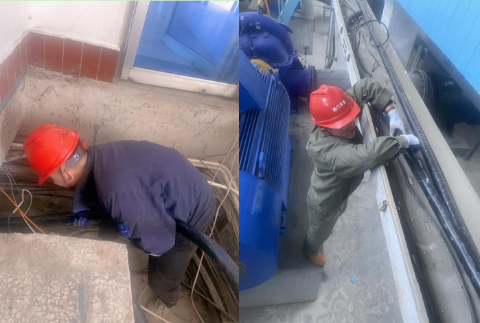從中壓泵房變頻柜敷設200多米的電纜至送水泵房泵機,途徑1米高的電纜隧道和5米高的電纜夾層,由于隧道內(nèi)部空間狹小,人在其中只能彎著腰蹲著作業(yè),多處轉(zhuǎn)彎,也給工作帶來不小的難度,但大家充分發(fā)揮水務人“特別能戰(zhàn)斗”的精神,齊心協(xié)力,最終歷時3小時完成任務。
