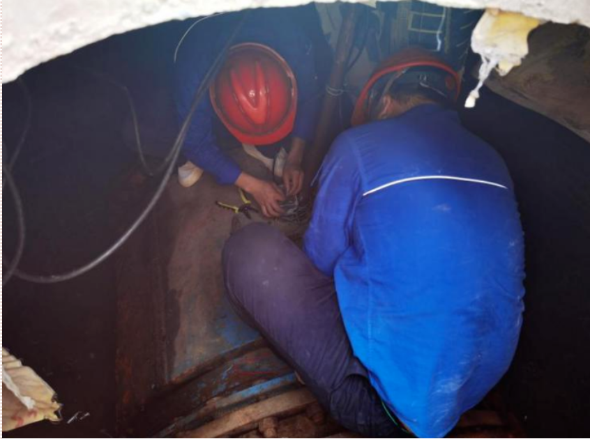 廠領(lǐng)導(dǎo)在綜合評(píng)估后,同意其思路,并作安全操作提醒。雖早有心理準(zhǔn)備,但在打開接線盒后的瞬間,李為龍等人還是倒吸一口涼氣。他們發(fā)現(xiàn)整個(gè)接線盒內(nèi)部被深色不透明的膠體充滿,無法掌握線路走向。短暫思索后,他們發(fā)揮水務(wù)人不怕苦、能戰(zhàn)斗的精神,嘗試按廠家給出建議,用熱風(fēng)槍加熱密封膠,但事與愿違,效果并不理想,密封膠沒有自動(dòng)融化流出。李為龍“改巧為笨”,在加熱的同時(shí)用小刀清理變軟的膠體。該處操作空間狹小,且不能損壞內(nèi)部的線路和接線端子,必須凝神聚力,是個(gè)“精細(xì)活”“體力活”。即便同事們輪番上陣,依然個(gè)個(gè)汗如雨下。功夫不負(fù)有心人,眾人合力熬過“漫長的”4小時(shí),最終完成了既定任務(wù)。