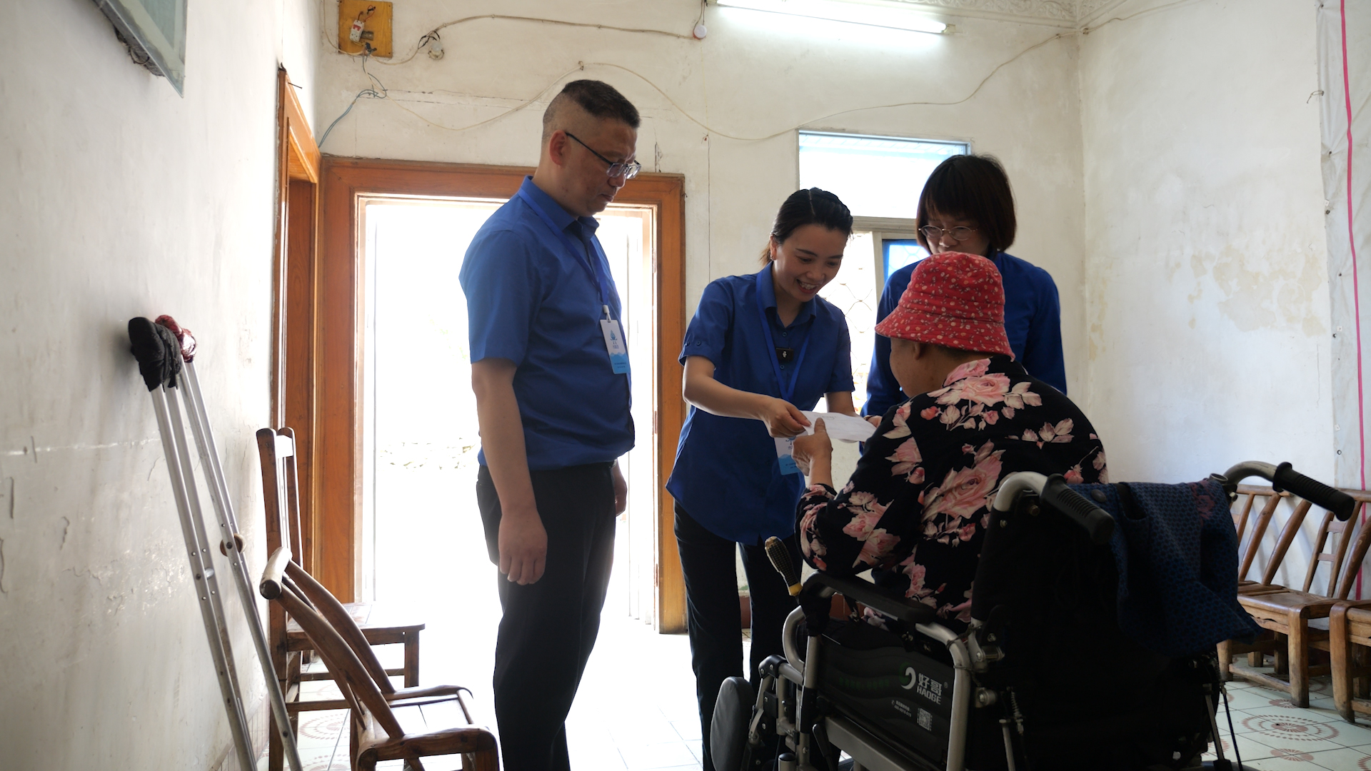 圖為水務(wù)集團(tuán)工作人員為出行困難老人送水費發(fā)票。