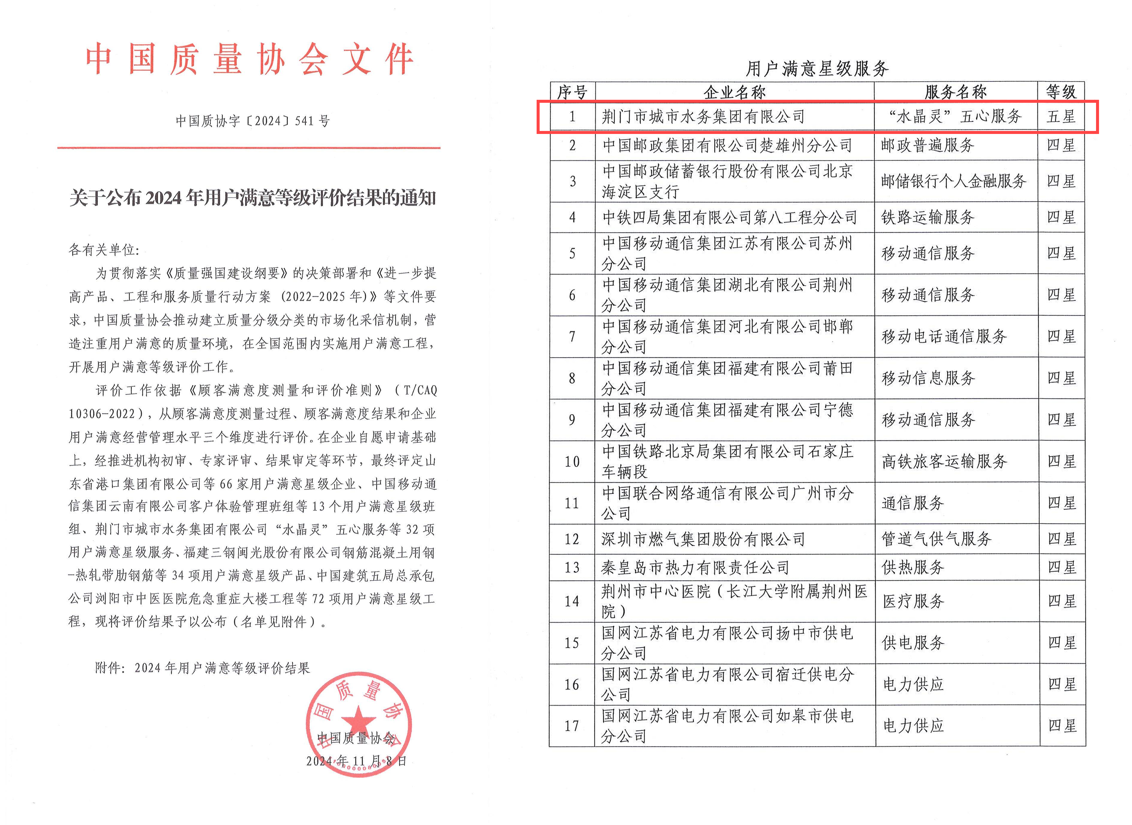 11月8日,中國質(zhì)量協(xié)會公布2024年用戶滿意等級評價(jià)結(jié)果,荊門市城市水務(wù)集團(tuán)有限公司(以下簡稱“集團(tuán)”)以“水晶靈”五心服務(wù)模式為特色,成為全國唯一一家獲評服務(wù)類五星的企業(yè),標(biāo)志著在供水服務(wù)領(lǐng)域已經(jīng)成為全國標(biāo)桿。