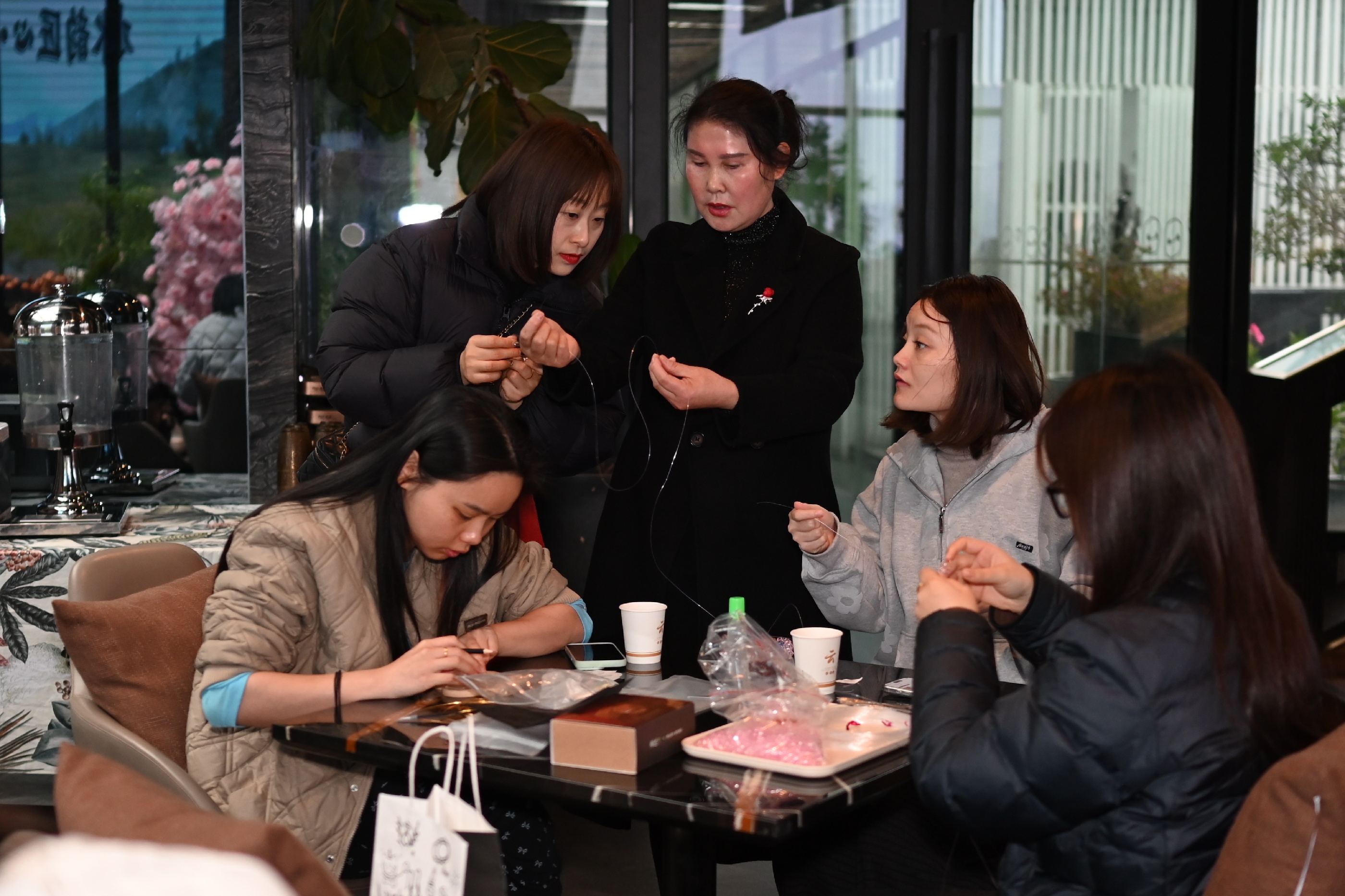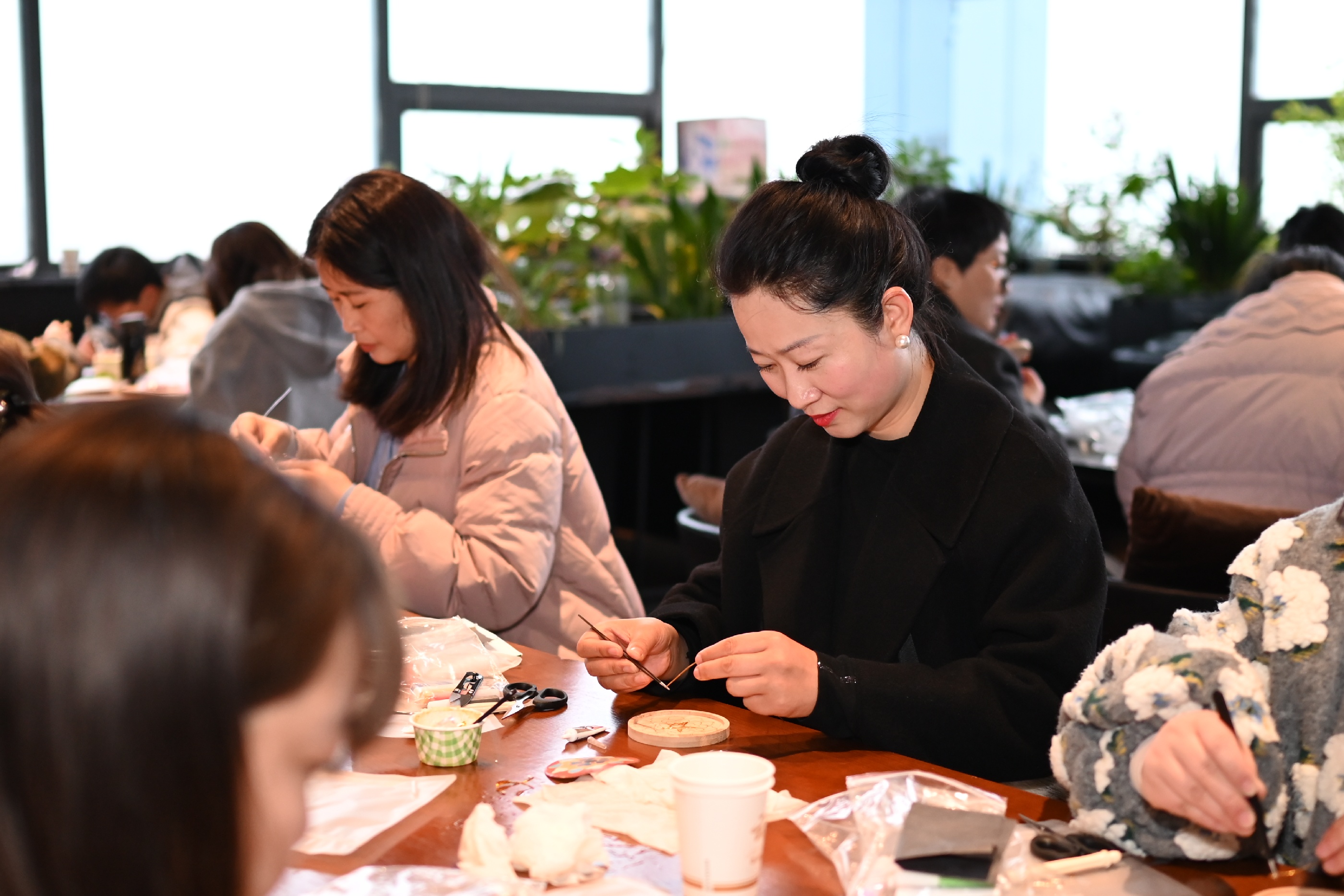 活動伊始,兩位指導(dǎo)老師分別講解掐絲琺瑯的技法和串珠包的編織技巧。隨后,女員工們們迅速投入創(chuàng)作——掐絲琺瑯工藝區(qū),大家用鑷子將金絲彎折成型,在盤底勾勒出蓮花、游魚或水波紋,再用鏟刀將彩砂層層點(diǎn)染,金絲與釉料交相輝映,一幅幅作品逐漸呈現(xiàn)。一旁的串珠包制作區(qū)同樣熱鬧非凡,晶瑩珠串在指尖流轉(zhuǎn)穿梭,穿針引線、配色綰結(jié),巧思于方寸間緩緩鋪展,一只只精巧別致的串珠包悄然成型。