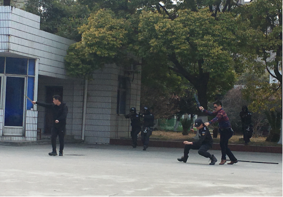 本次演練以在全國(guó)“兩會(huì)”召開前夕,2名暴恐份子密謀在市供水總公司三水廠采取投毒方式實(shí)施暴恐襲擊為背景展開。市公安局指揮中心接到水廠員工報(bào)案,2名暴恐份子駕車攜帶劇毒氰化物和匕首來(lái)到三水廠,密謀投毒、傷人。市公安局指揮中心立即派轄區(qū)派出所和巡邏組前往處置。在投毒失敗后,嫌疑人刺傷安保人員并挾持人質(zhì),與民警對(duì)峙。隨后,市公安局迅速啟動(dòng)反恐防范一級(jí)響應(yīng),調(diào)派轄區(qū)分局、巡特警、刑偵、交警等部門趕赴現(xiàn)場(chǎng)開展工作。短短3分鐘,暴徒迅速被控制,其中有一名暴徒被當(dāng)場(chǎng)擊斃,人質(zhì)被成功解救。之后,120急救中心趕往現(xiàn)場(chǎng)救治,同時(shí)環(huán)境監(jiān)測(cè)部門迅速開展水質(zhì)檢測(cè)評(píng)估,確保水廠供水安全。至此,反恐防暴演練活動(dòng)順利結(jié)束。