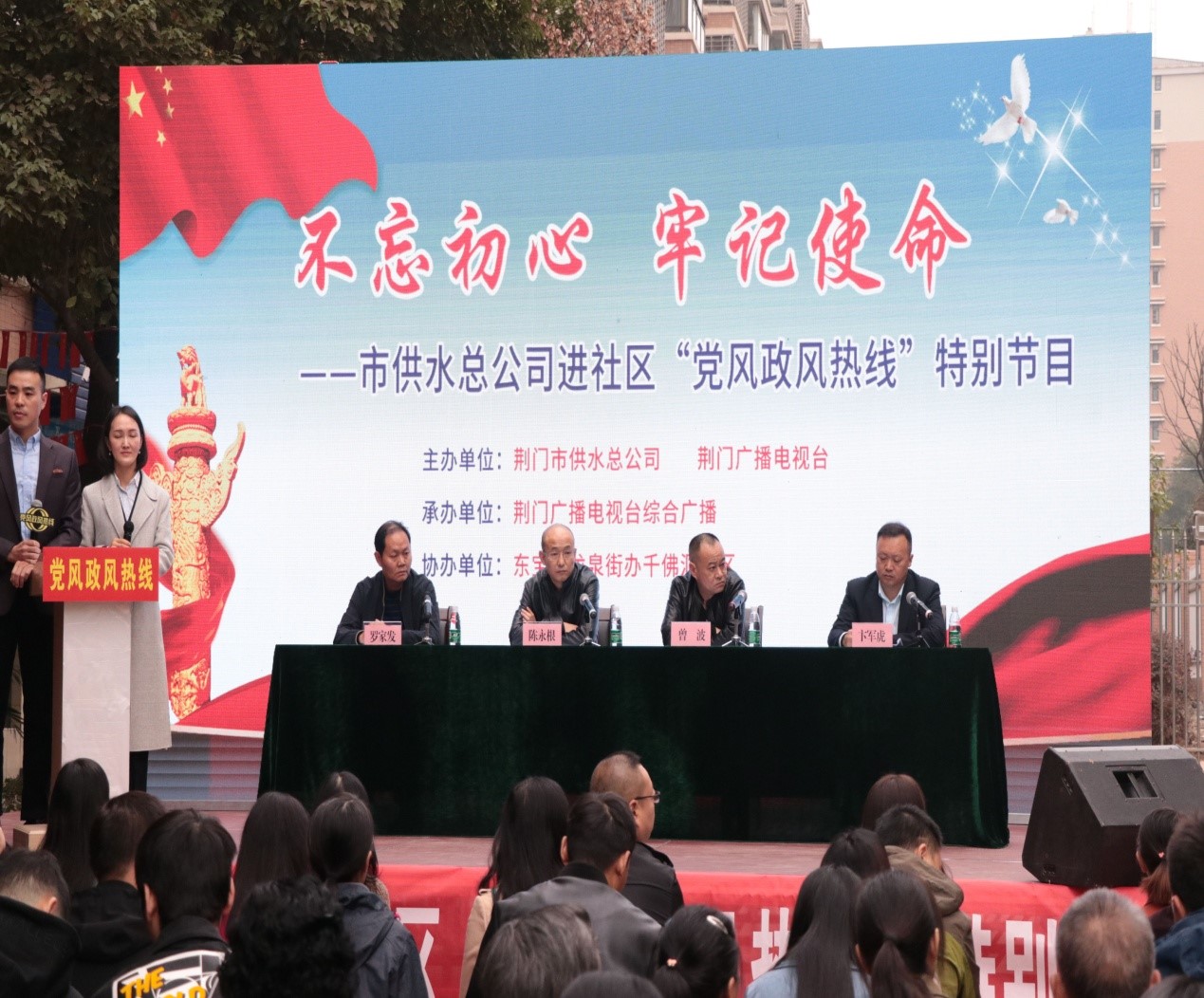11月 6日上午,由荊門(mén)市供水總公司和荊門(mén)廣播電視臺(tái)聯(lián)合舉辦的“荊門(mén)供水進(jìn)社區(qū)‘黨風(fēng)政風(fēng)熱線’特別節(jié)目”在荊門(mén)千佛洞社區(qū)舉行。市供水總公司黨委書(shū)記、總經(jīng)理陳永根帶領(lǐng)領(lǐng)導(dǎo)班子相關(guān)成員參加節(jié)目現(xiàn)場(chǎng)(網(wǎng)絡(luò))直播,圍繞“不忘初心、牢記使命”主題教育,傾聽(tīng)民情民意,接受現(xiàn)場(chǎng)問(wèn)政,回應(yīng)百姓訴求,解決用戶(hù)難題。