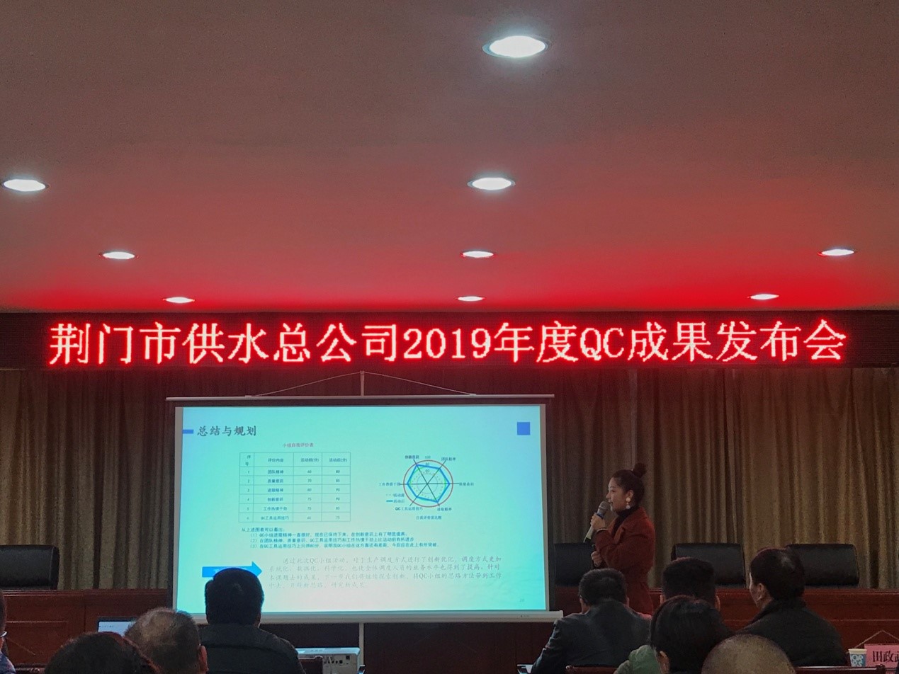 12月6日,荊門市供水總公司首屆QC成果發(fā)布會(huì)在總公司六樓會(huì)議室順利召開,質(zhì)量專家、國(guó)家級(jí)評(píng)審員劉佐光老師、荊門市質(zhì)量協(xié)會(huì)田政武秘書長(zhǎng)、公司副總經(jīng)理徐安祥及各部門主要負(fù)責(zé)人參加了發(fā)布會(huì),會(huì)議由QC工作組組長(zhǎng)劉昕平主持。