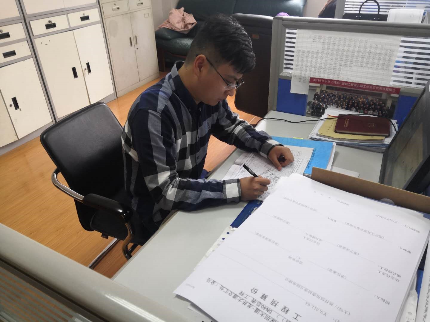 劉貝的主要工作是用戶(hù)報(bào)裝接待、現(xiàn)場(chǎng)勘察、圖紙預(yù)算審核傳遞、工程合同擬定、下發(fā)施工通知單、客戶(hù)咨詢(xún)等。2019年,他共受理用戶(hù)現(xiàn)場(chǎng)勘察約700起,平均每周約15起,勘察范圍西至宏圖愛(ài)飛客小鎮(zhèn)、東至彭墩長(zhǎng)壽產(chǎn)業(yè)園、南至團(tuán)林汽車(chē)工業(yè)園、北至子陵萬(wàn)華工業(yè)園等,全年共擬定各類(lèi)大小合同約340份,下發(fā)各類(lèi)施工通知單約500份,從未受到用戶(hù)投訴。