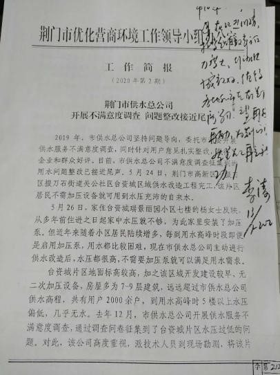 7月13日,市委副書(shū)記、市委政法委書(shū)記李濤在市優(yōu)化辦第2期工作簡(jiǎn)報(bào)專文《荊門(mén)市供水總公司開(kāi)展不滿意度調(diào)查 問(wèn)題整改接近尾聲》上作出批示,指出“市供水總公司在改進(jìn)服務(wù)、提高工作效率方面力度大、行動(dòng)快、成效好,值得各地和市直有關(guān)部門(mén)學(xué)習(xí),望再接再厲,為荊門(mén)高質(zhì)量發(fā)展再立新功”,對(duì)公司優(yōu)化供水服務(wù)工作給予高度評(píng)價(jià)和充分肯定。