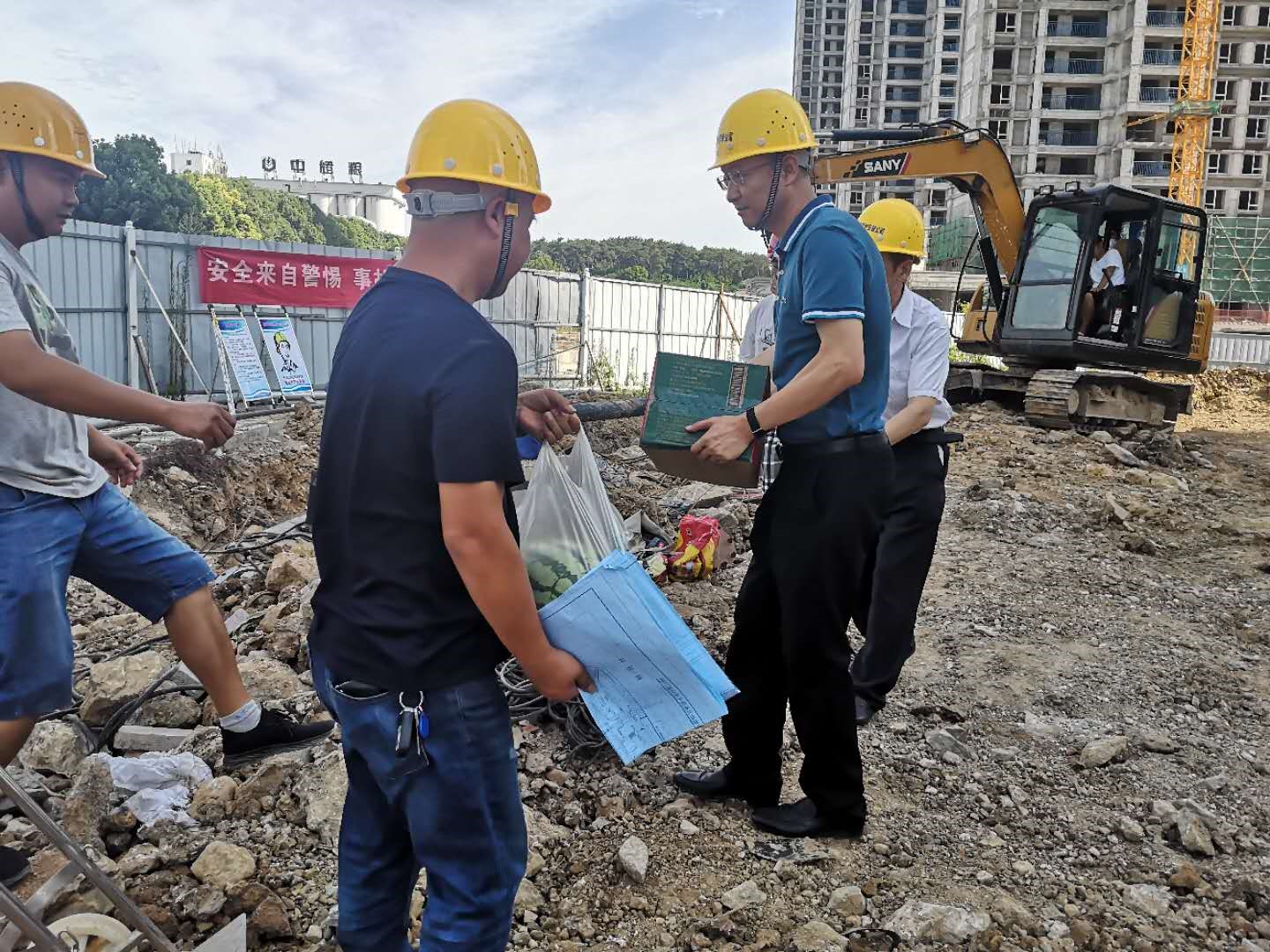 炎炎夏日,驕陽似火。連日來我市高溫黃色預(yù)警信號(hào)持續(xù)拉響,這給在建給排水工程項(xiàng)目施工和供水生產(chǎn)帶來諸多不便和困難。為切實(shí)做好防暑降溫工作,確保夏季高溫安全生產(chǎn),8月7日上午,市供水總公司黨委書記、總經(jīng)理陳永根帶領(lǐng)公司黨委班子成員,分別到“誠愛佳苑”戶表安裝項(xiàng)目、長興大道管網(wǎng)改造工程等在建施工工地現(xiàn)場,慰問在高溫酷暑中堅(jiān)守崗位、辛勤勞動(dòng)的一線工人,為他們帶去西瓜、礦泉水等防暑降溫物品。